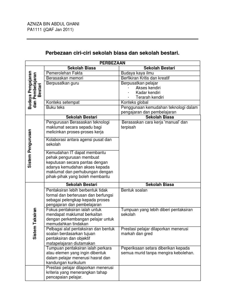 Perbezaan Ciri Sekolah Biasa Bestari