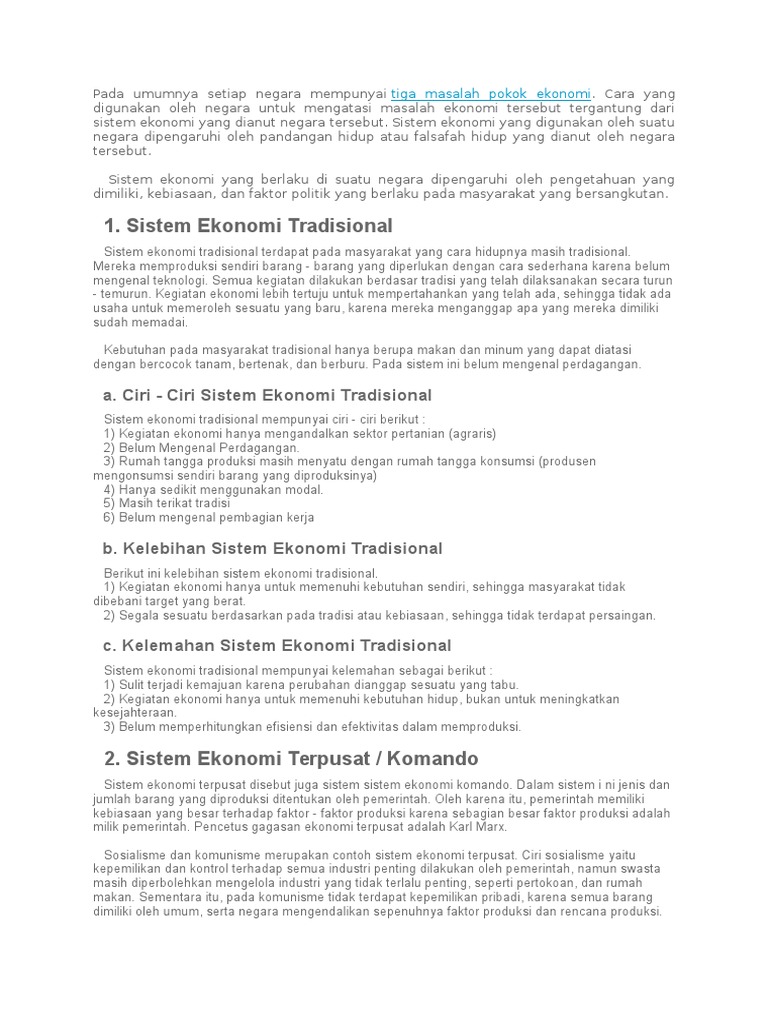 Sistem Ekonomi Tradisional Pengertian Ciri Contoh Kelebihan Dan Kekurangannya
