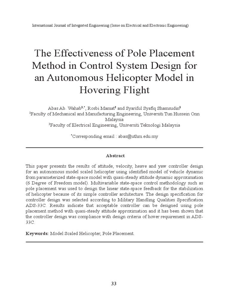 The Effectiveness Of Pole Placement Method In Control System Design For An Autonomous Helicopter Model In Hovering Flight Helicopter Rotor Control Theory