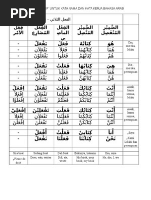Kata kerja bahasa arab pdf. Semakin hari hasrat dan nafsu saya untuk menulis di blog ini semakin besar. Dalam segi butuhnya pada obyek atau tidak fi il terbagi menjadi lazim intransitif dan muta addi transitif. Pembentukan kata kerja mengikut kala dalam bahasa arab mempunyai hubung kait antara satu dengan yang lain. 4 1 1 al ism ﻢﺳﻻﺍ kata nama di dalam bahasa arab al ism atau kata nama ini dibahagikan kepada dua iatu ism al nakirat ﺓﺮ ﻜﻨﻟﺍ kata nama am dan ism al ma rifat ﺔﻓﺮ ﻌﳌﺍ kata nama khas.