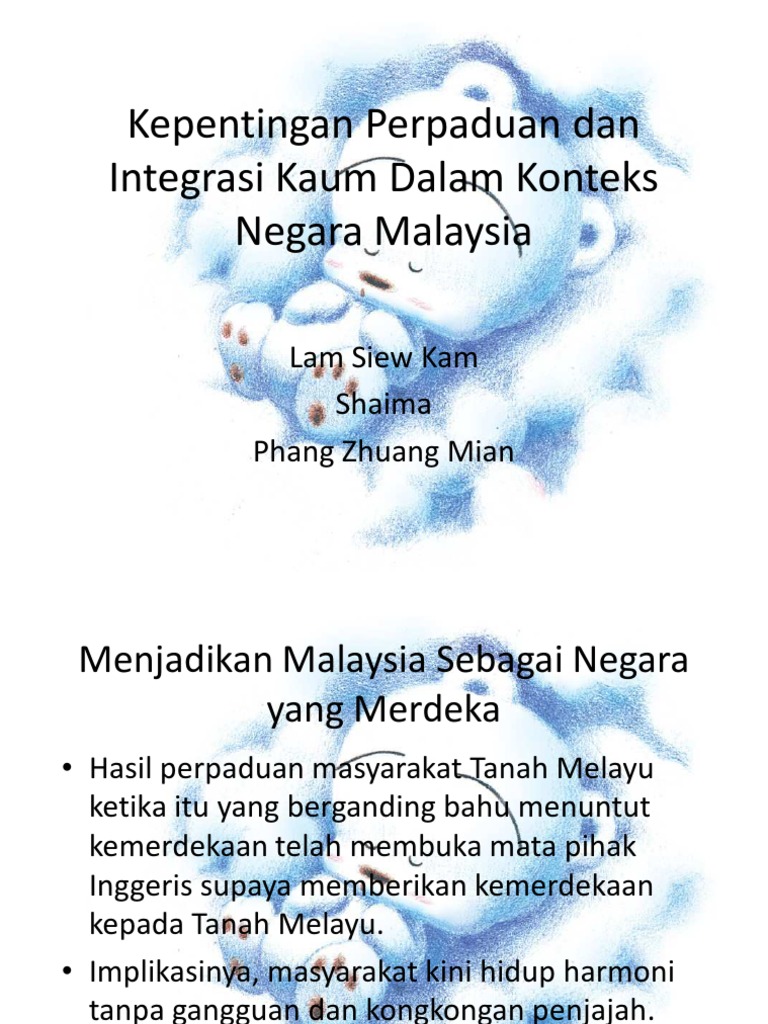 Dalam budaya baru yang dibentuk hilangnya identiti masyarakat dan perbezaan kebudayaan. Bagi memantapkan lagi perpaduan dikalngan rakyat pelbagai etnik dan kaum kerajaan telah menubuhkan kementerian negara dan pembangunan masyarakat pada 27 oktober 1990 dengan tujuan untuk mwnggalakkan perpaduan masyarakat pelbagai kaumda integrasi memberi bantuan khidmat kebajikan masyarakat membangunkan dan mengintegrasikan masyarakat kaum asli memajukan kepentingan dan penglibatan wanita. Pengenalan dasar 7 1 hasil pembelajaran kerajaan menganalisis kepentingan program perpaduan dan peranan 7 2 integrasi nasional demimasyarakat kestabilan dan kandungan bab 7 kesejahteraan sosial di peranan 7 3 malaysia. Secara tidak langsung perpaduan dapat menjamin keselamatan negara kestabilan ekonomi politik dalam jangka masa panjang.