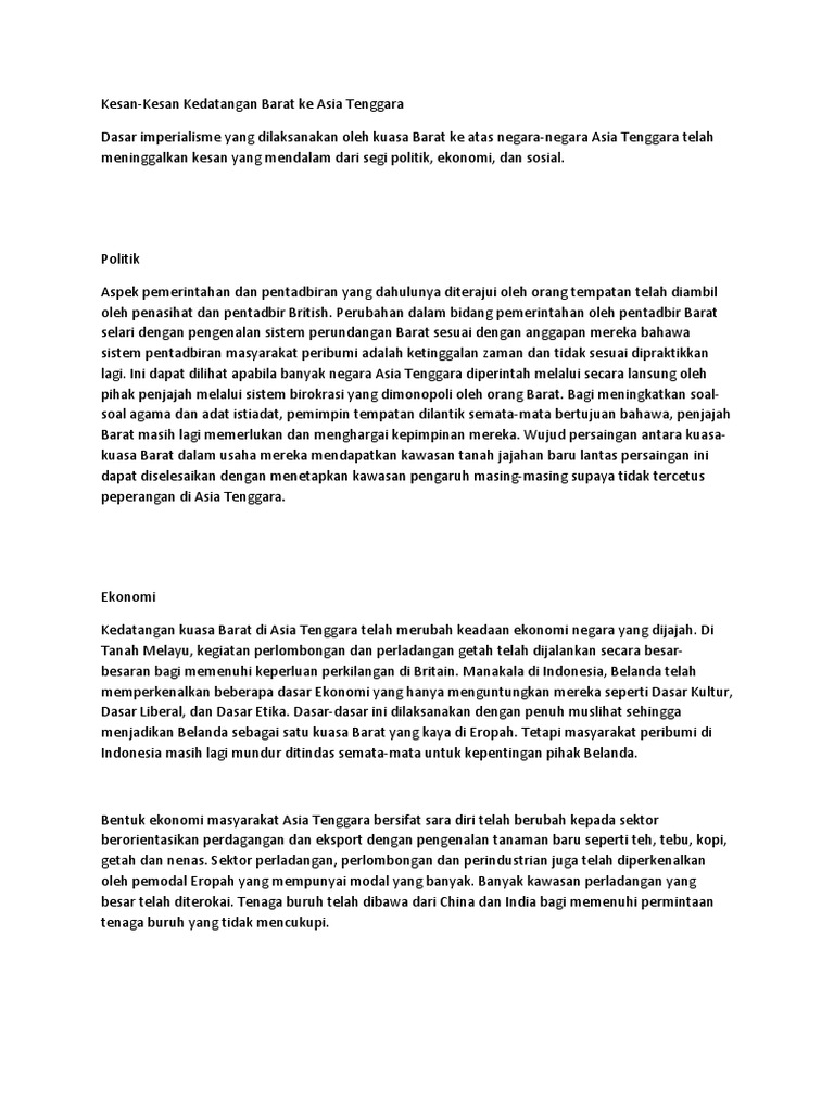 Kesan Kedatangan Kuasa Barat Ke Tanah Melayu Dari Segi Politik Ekonomi Dan Sosial