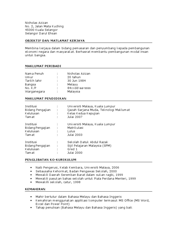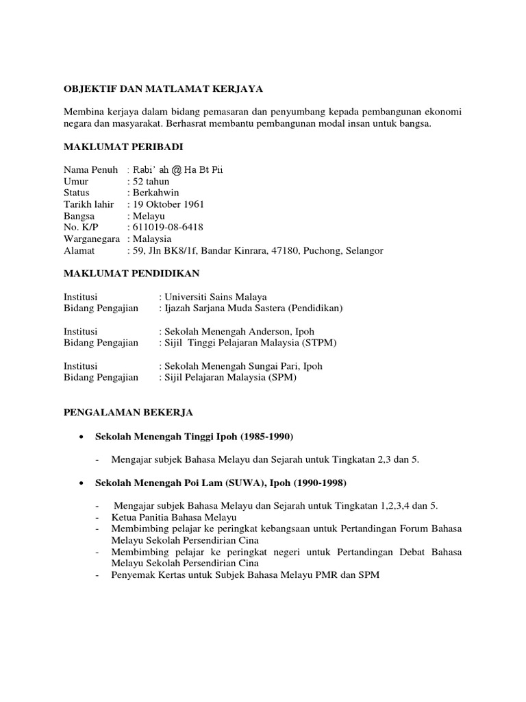 Objektif Matlamat Meningkatkan Dan Memajukan Diri Dalam Bidang Yang Diceburi Bagi Menjadikan Kerjaya Profession Resume Format Resume Sample Resume Format