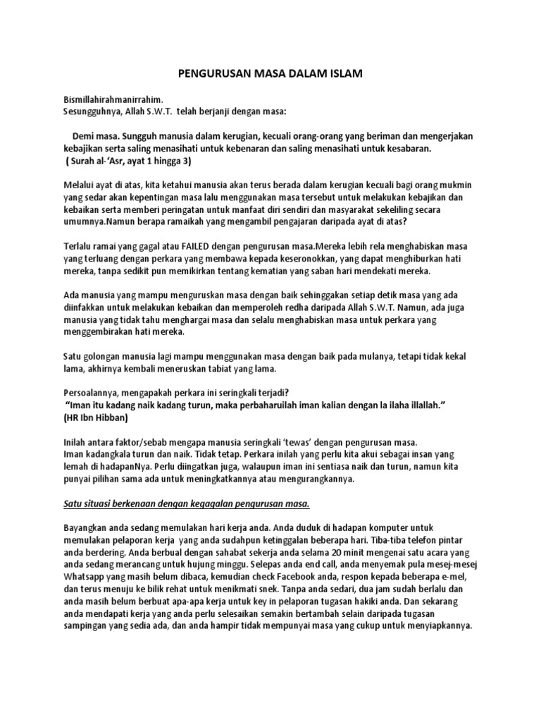 Ingatan allah ta ala buat seluruh manusia allah s w t telah mengingatkan manusia tentang kepentingan masa dan ketelitian dalam menguruskannya. Apabila iman sudah tetap di hati maka pengurusan mengenai masa bukanlah masalah terbesar yang perlu dihadapi. Firman allah s w t dalam surah al asr masa yang bermaksud. Aspek lain yang turut dikaji ialah berkaitan dengan bentuk pengurusan masa yang diamalkan serta persepsi mereka tentang bentuk pengamalan pengurusan masa yang berkesan.