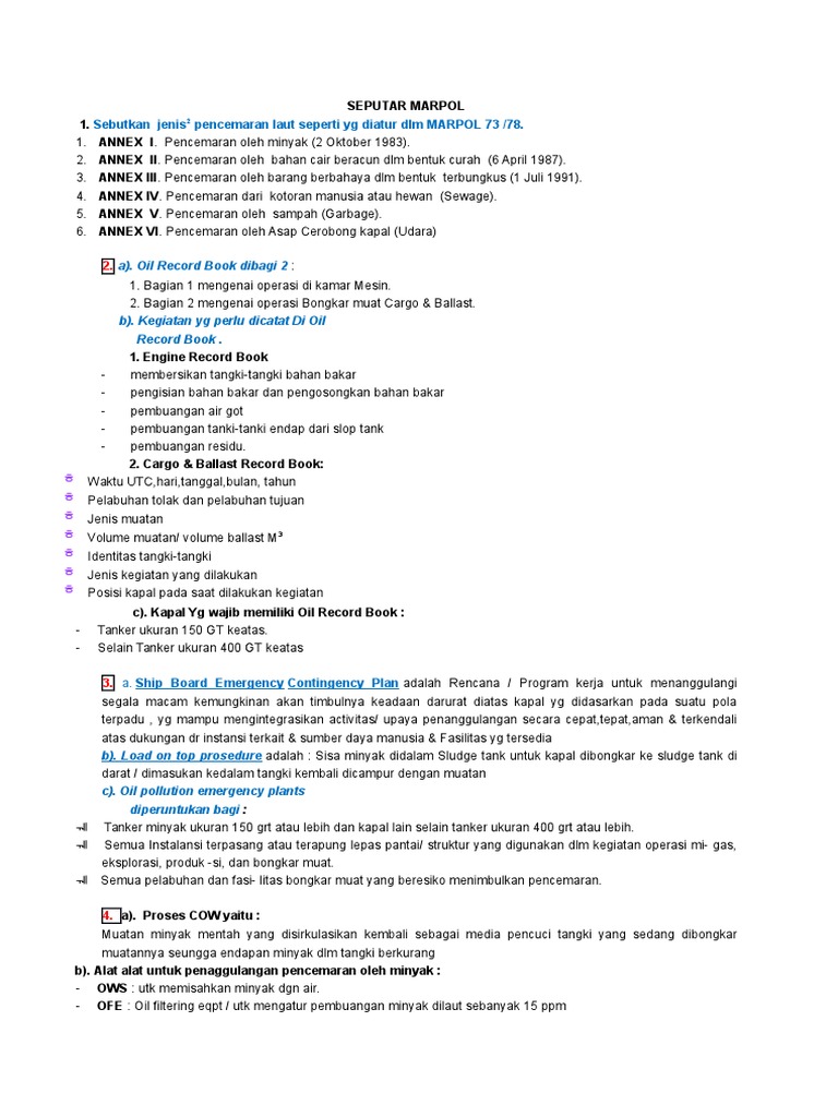 Polmar Docx Sebutkan Jenis2 Pencemaran Laut Seperti Yg Diatur Dlm Marpol 73 78 1 Annex I Pencemaran Oleh Minyak 2 Oktober 1983 2 Annex Ii Pencemaran Course Hero