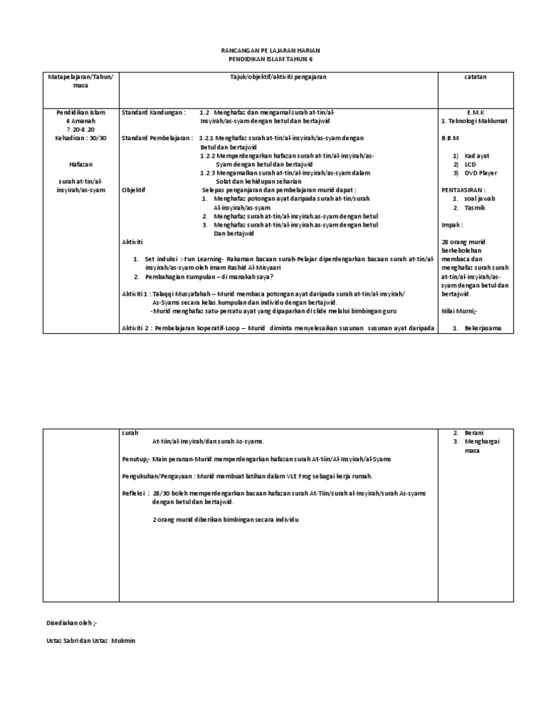 Rancangan Pengajaran Harian Pendidikan Islam Pendidikan Khas Tahun 6