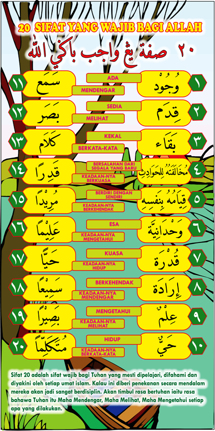 Sifat 20 dan maksudnya dalam jawi. Namun berdasarkan dalil dalil baik dalil naqli atau aqli sifat yang diketahui secara umum berjumlah 20. Mereka hanya mengikut hawa nafsu dan bertaklid buta dengan orang yang juga tidak mempelajari ilmu sifat 20. Allah swt memiliki sifat wajib mustahil dan jaiz sebagai sifat kesempurnaan bagi nya. Sifat sifat tersebut antara lain.