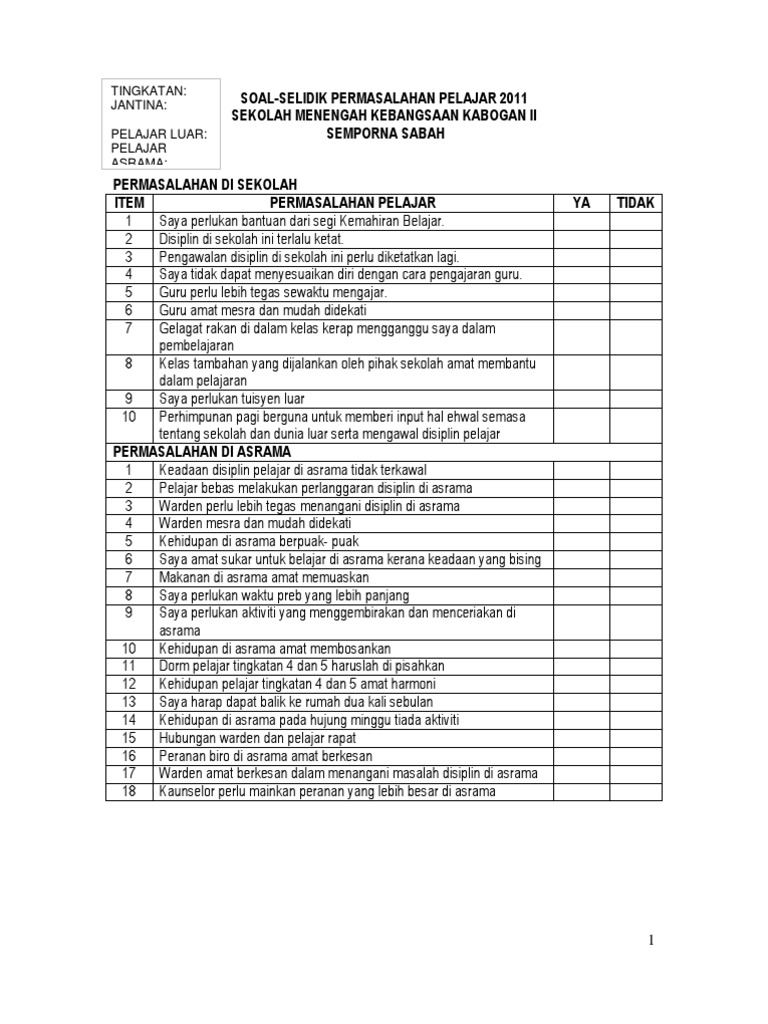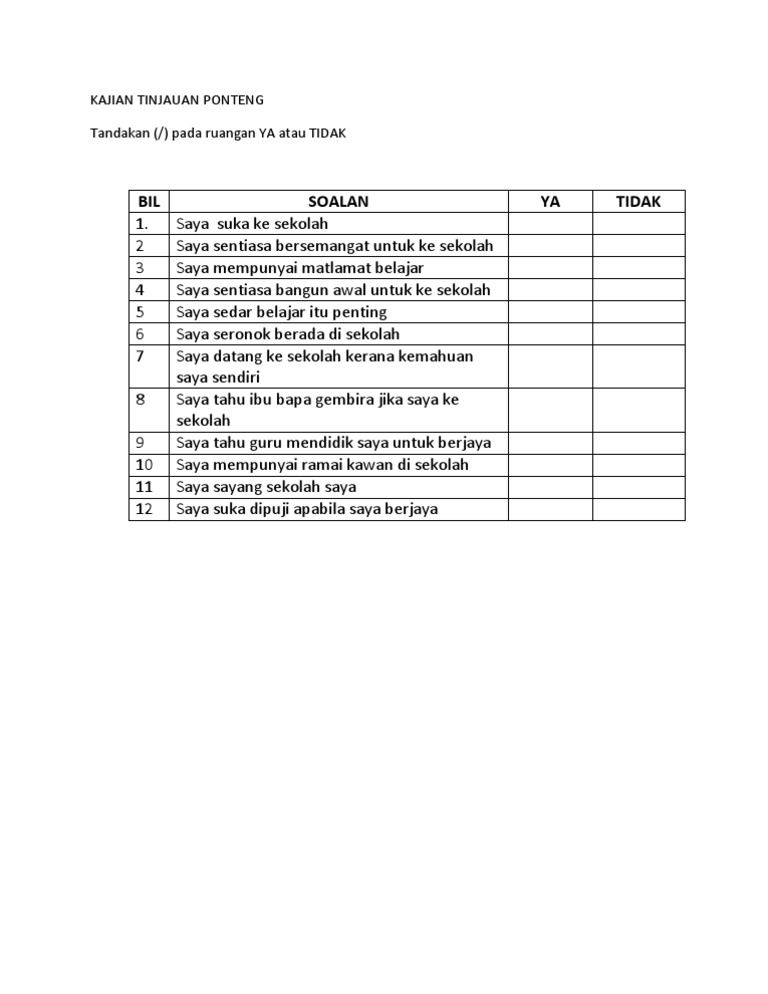 Soal selidik masalah ketidakhadiran murid sesi bersama inspektor polis perhubungan sekolah pelaksanaan program 2 kali setahun. Borang soal selidik kusza fakulti punca gejala ponteng sekolah dikalangan pelajar tahun 4 latar belakang soal selidik yang dijalankan oleh pihak saya adalah untuk mendapatkan maklumat mengenai satu soal selidik dan jalankan penilaian sumatif terhadap punca gejala ponteng sekolah dikalangan pelajar tahun 4. Borang soal selidik kajian kes ponteng dalam kalangan pelajar sekolah. Adakah anda memang susah malas untuk bangun pada waktu awal pagi.