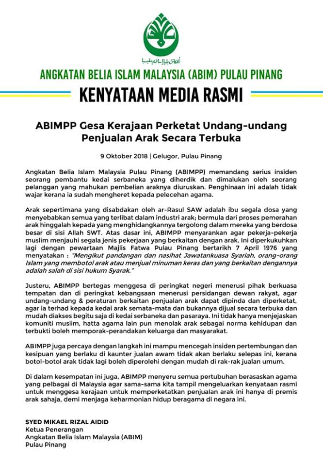 Abimpp Gesa Kerajaan Perketat Undang Undang Penjualan Arak Secara Terbuka Abim Pulau Pinang